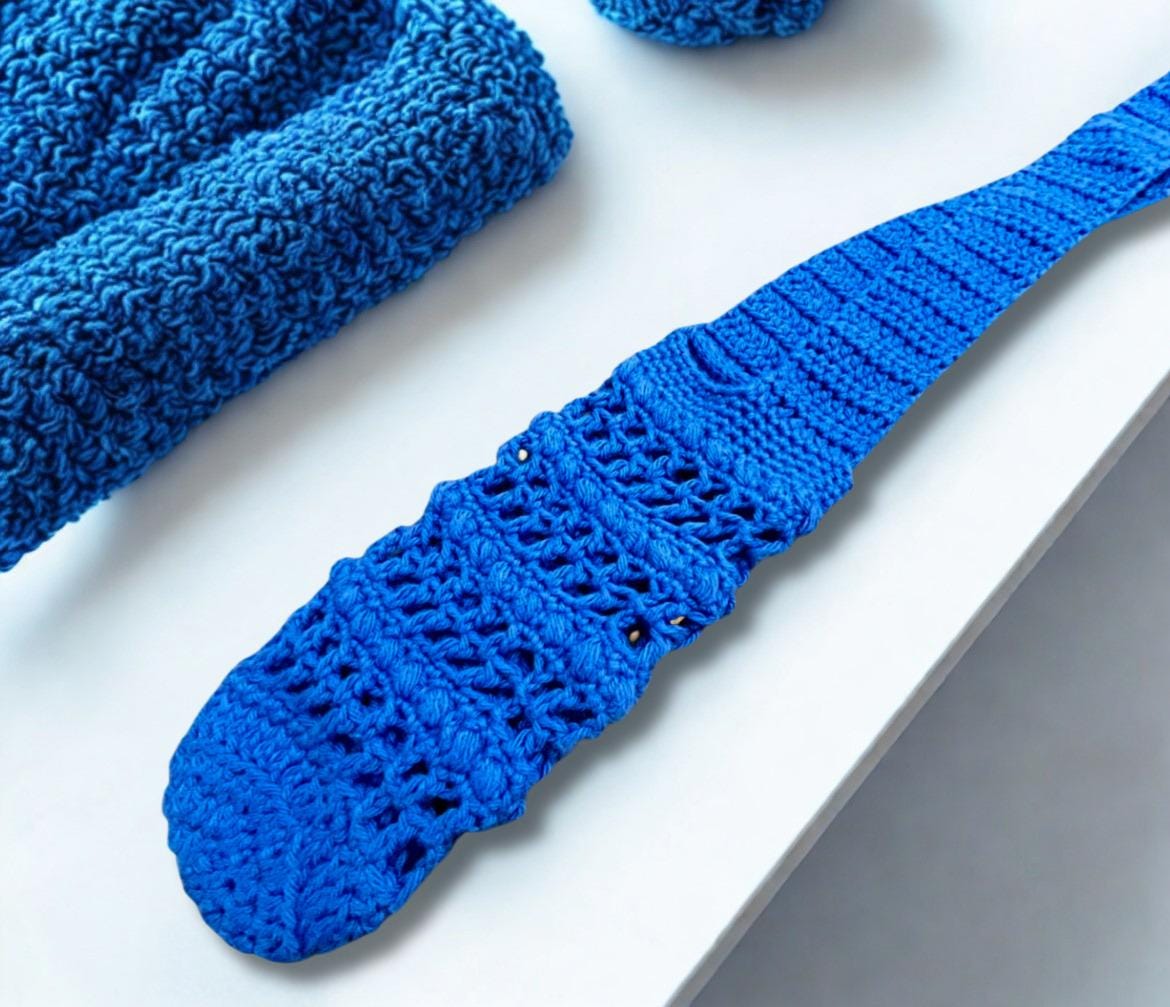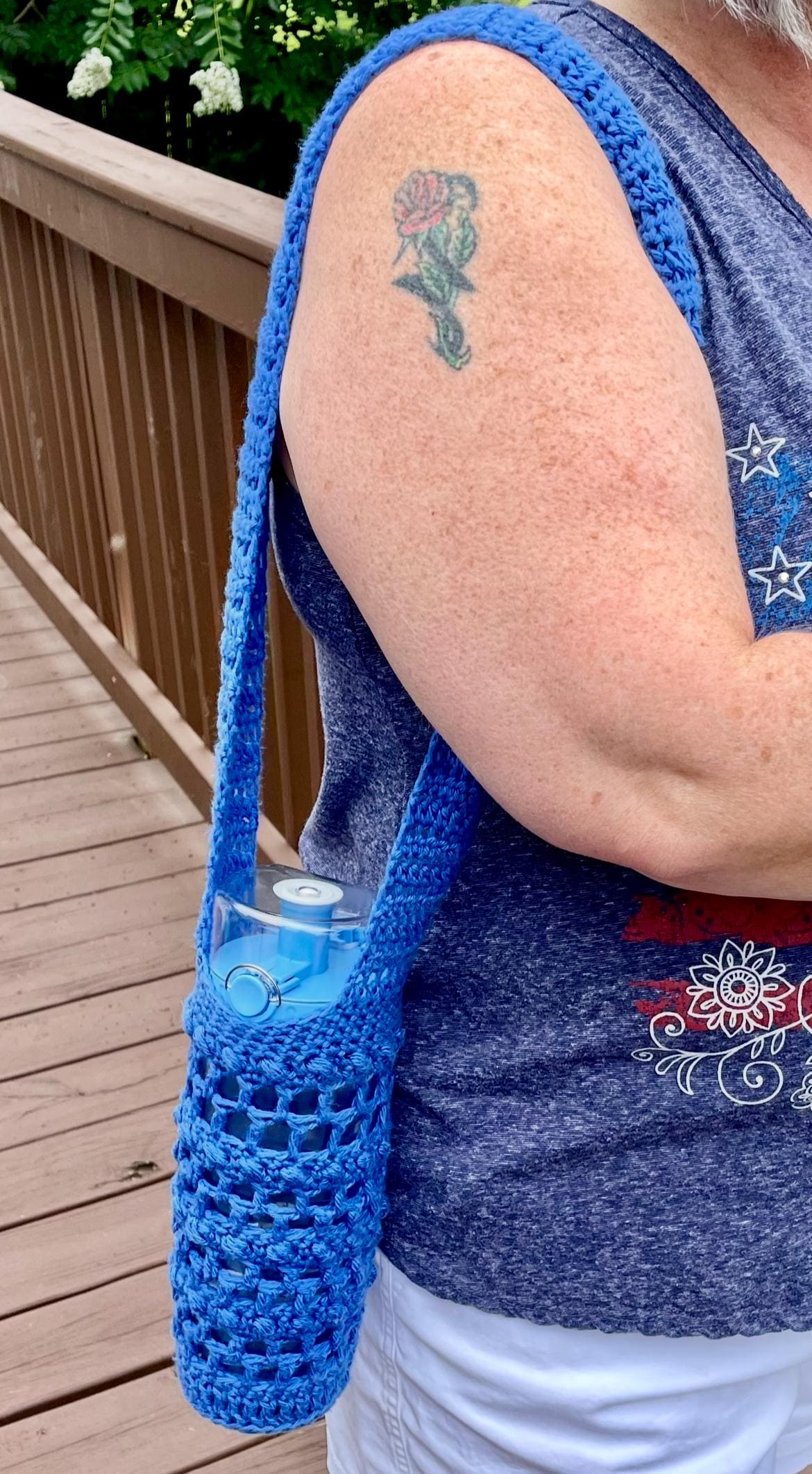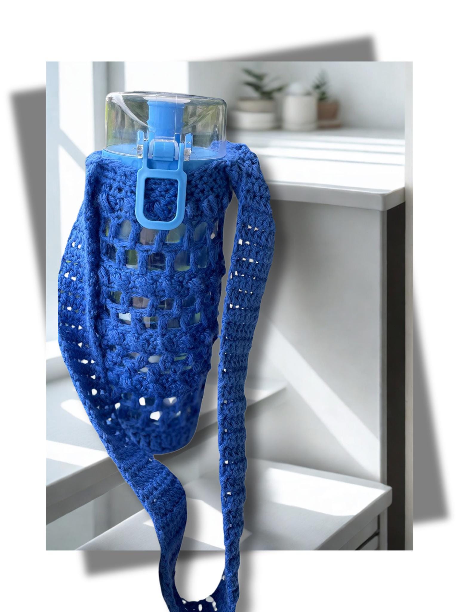 Carry your water bottle in style with this handmade Waterbottle Holder crafted from durable blue cotton yarn. Easy to clean and perfect for hands-free walks or runs, this crochet holder adds a touch of charm to your daily activities. Stay hydrated on-the-go with this practical and fashionable accessory!