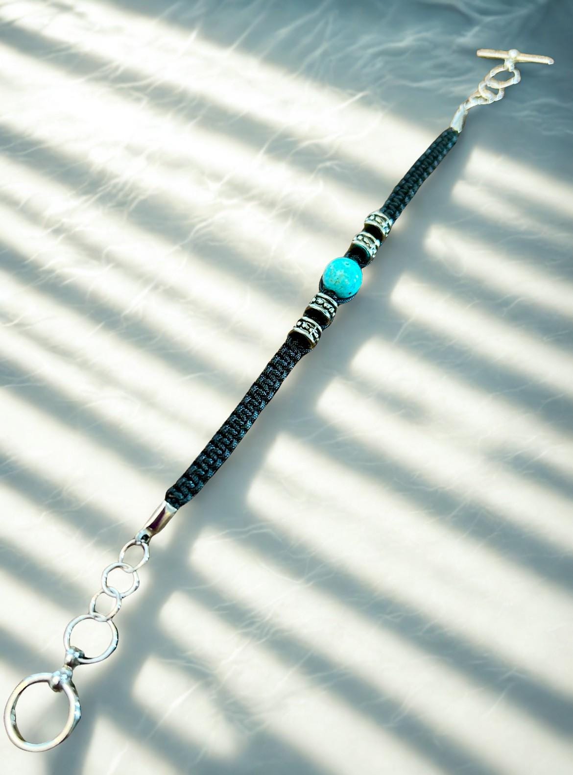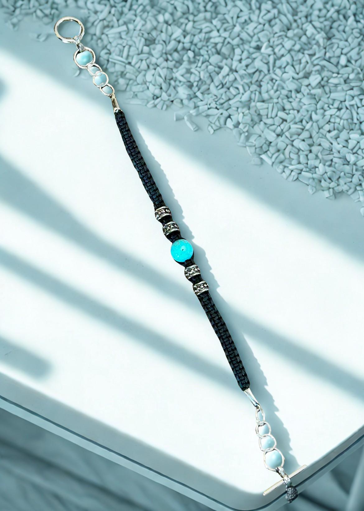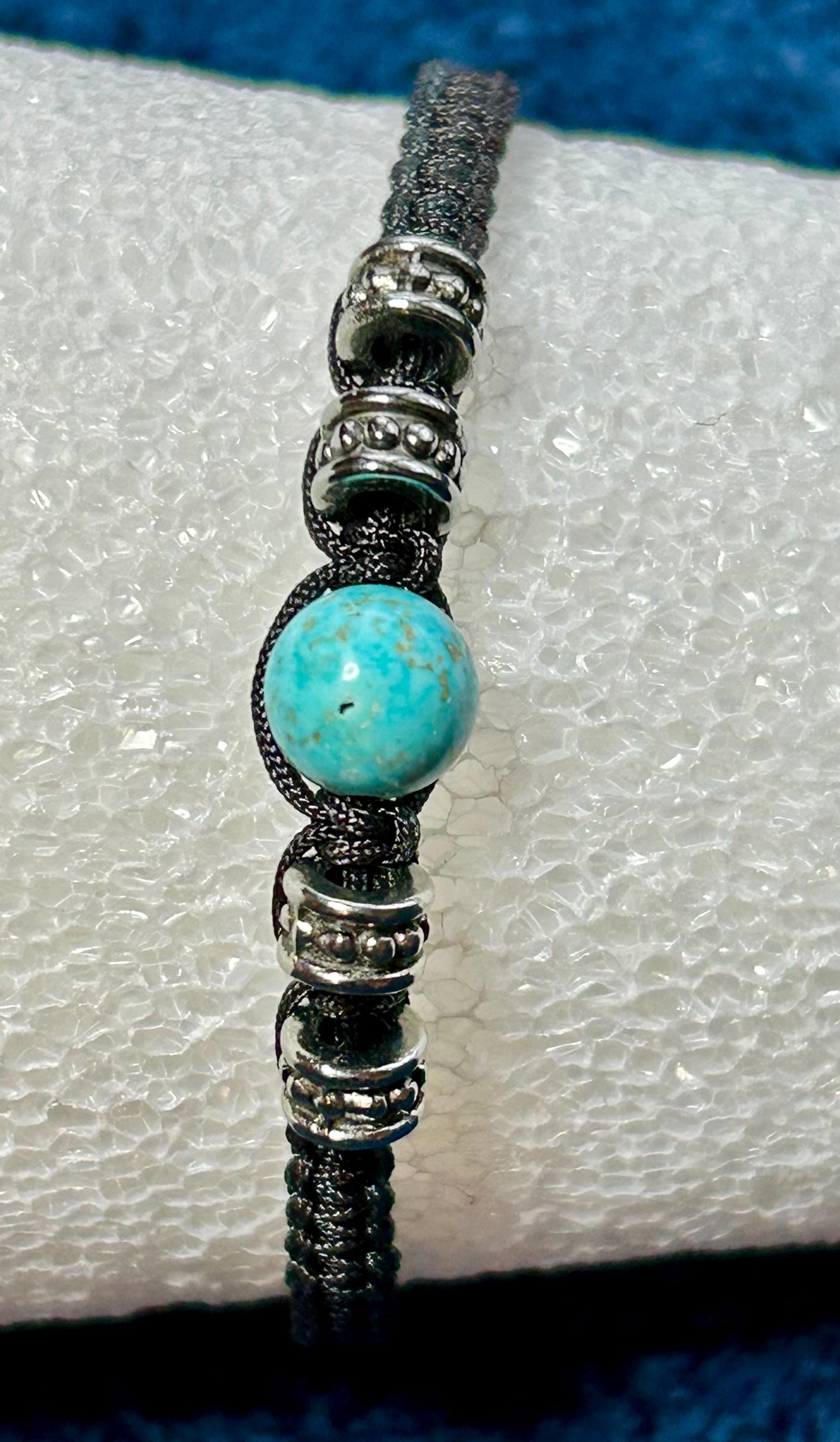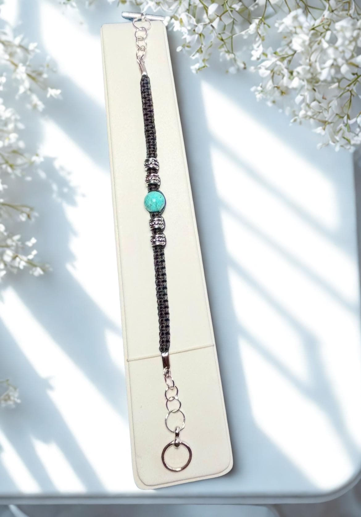 This macrame boho bracelet showcases a handcrafted design featuring a natural turquoise gemstone bead. Its intricate pattern is complemented by a secure toggle clasp, ensuring both style and functionality. Perfect for adding a touch of bohemian elegance to any outfit, this accessory reflects timeless craftsmanship and natural beauty.