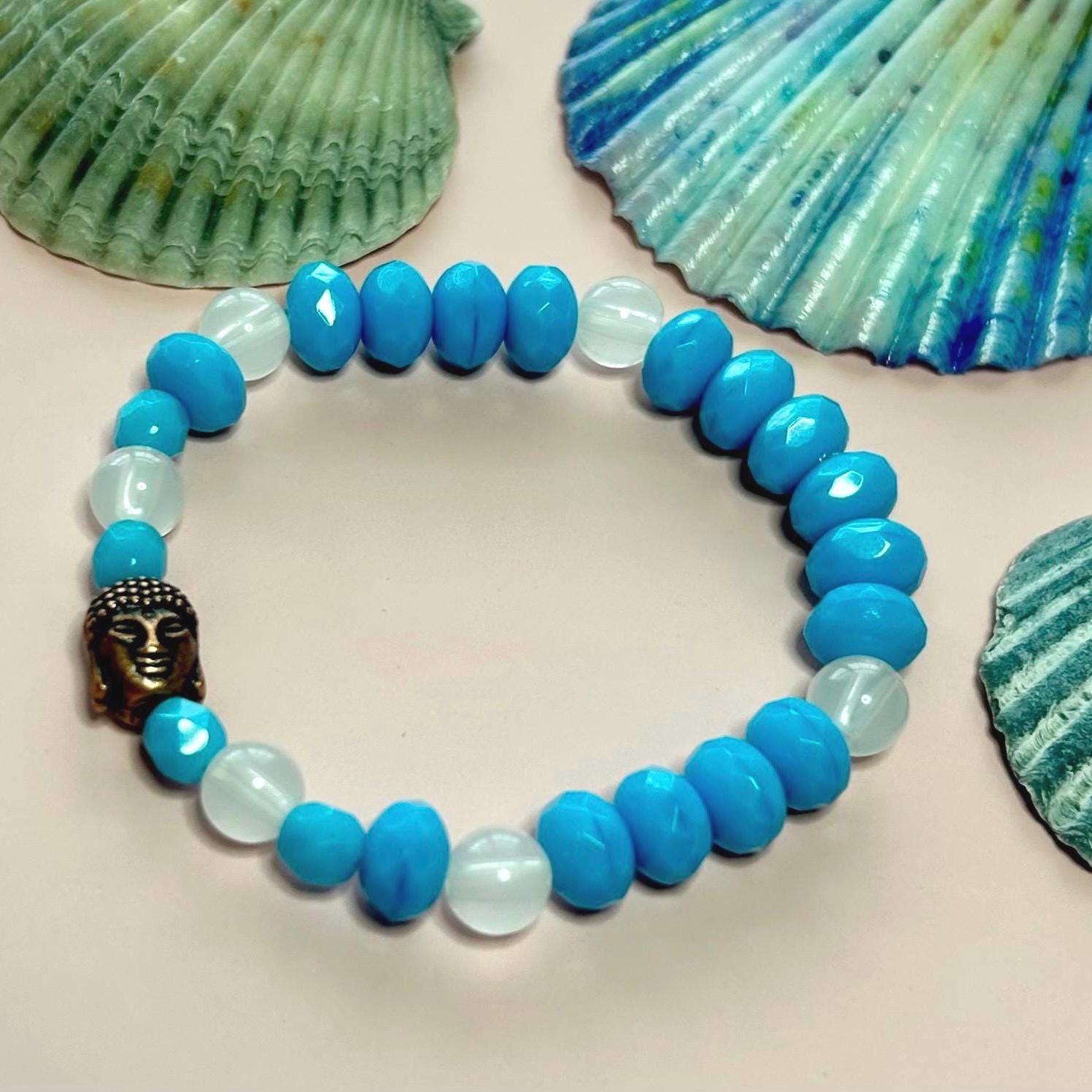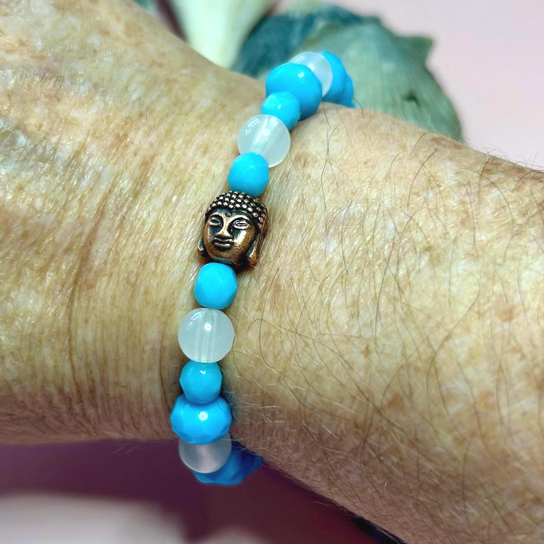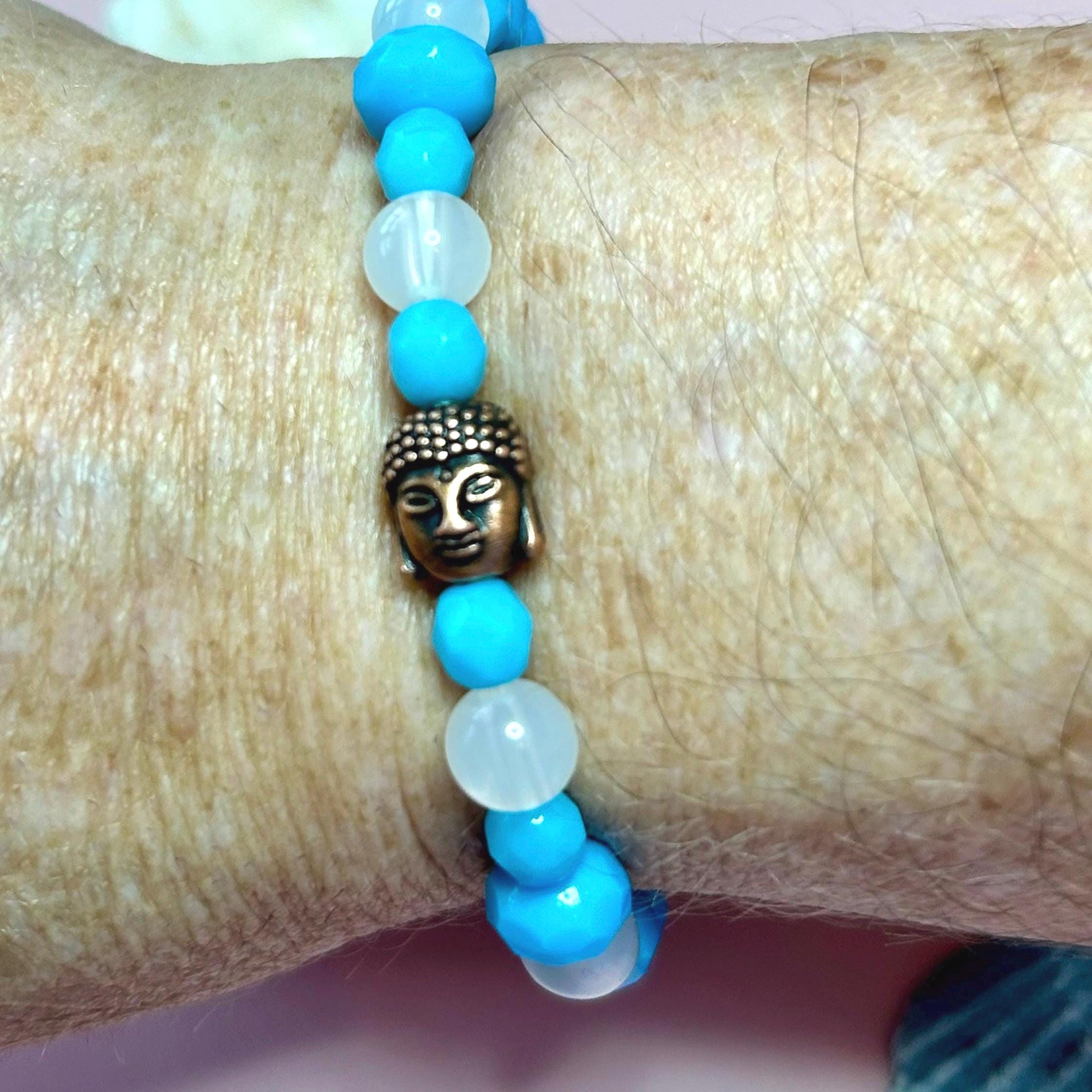 The Turquoise Glass Rondelle Beads Elastic Bracelet with Copper Buddha Head is a unique and stylish piece of handcrafted jewelry. The rondelle glass beads in a beautiful turquoise color are accented with a copper Buddha head charm, adding a touch of spirituality and nature-inspired theme to the bracelet. Round white beads have been added throughout for some added color combinations also.
