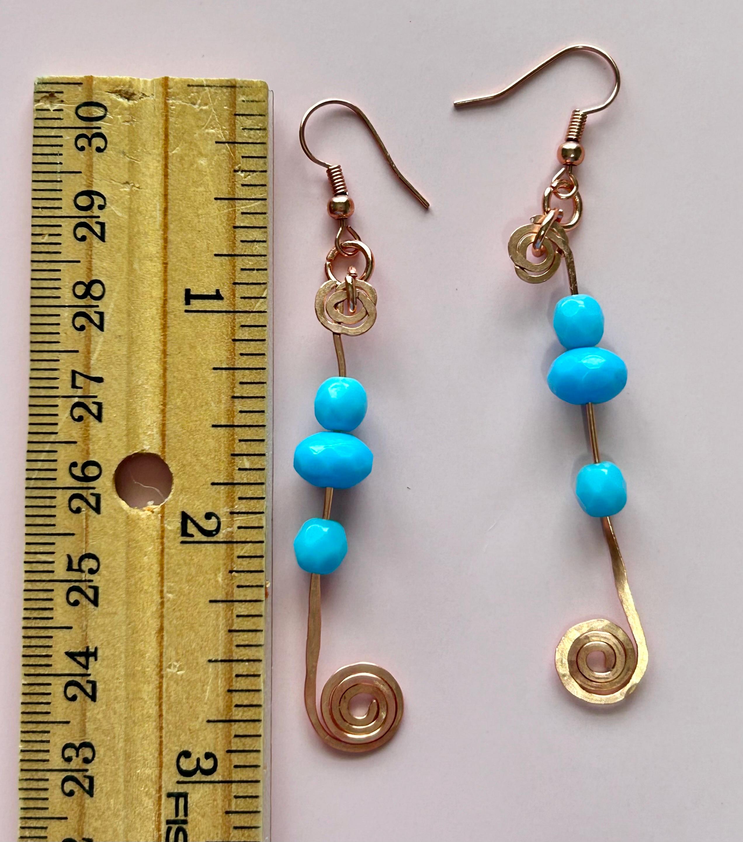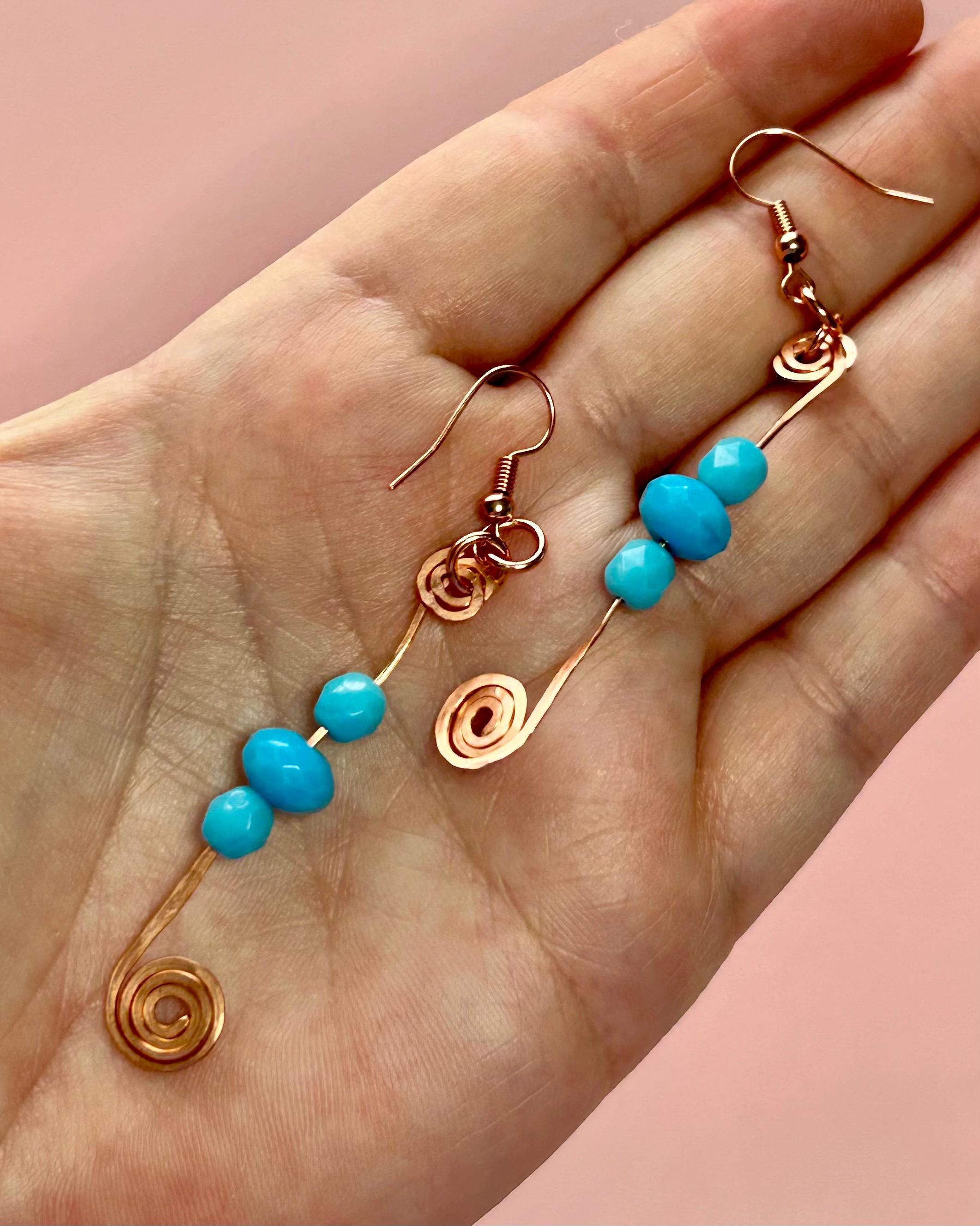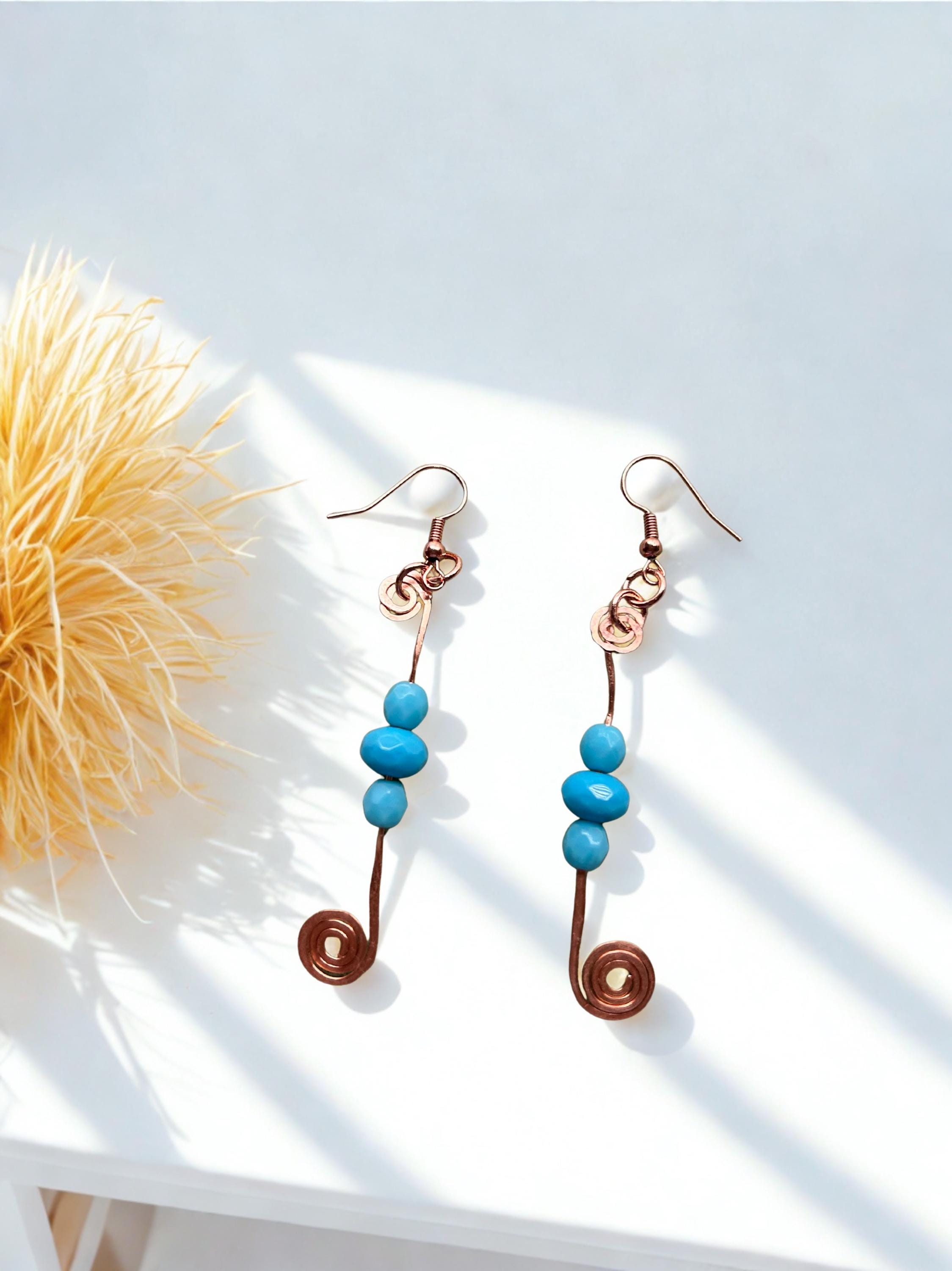 These wire wrapped hammered copper spiral earrings with turquoise glass beads showcase a rondelle shape and a hook closure. The earrings feature turquoise glass beads as the main stone, Made of copper wire with a nickel-free feature, these earrings are 3 inches in length and about a 1/2 inch wide. The bohemian style makes these earrings a unique and beautiful accessory for women looking to add a touch of nature to their outfit. These earrings are proudly handmade.