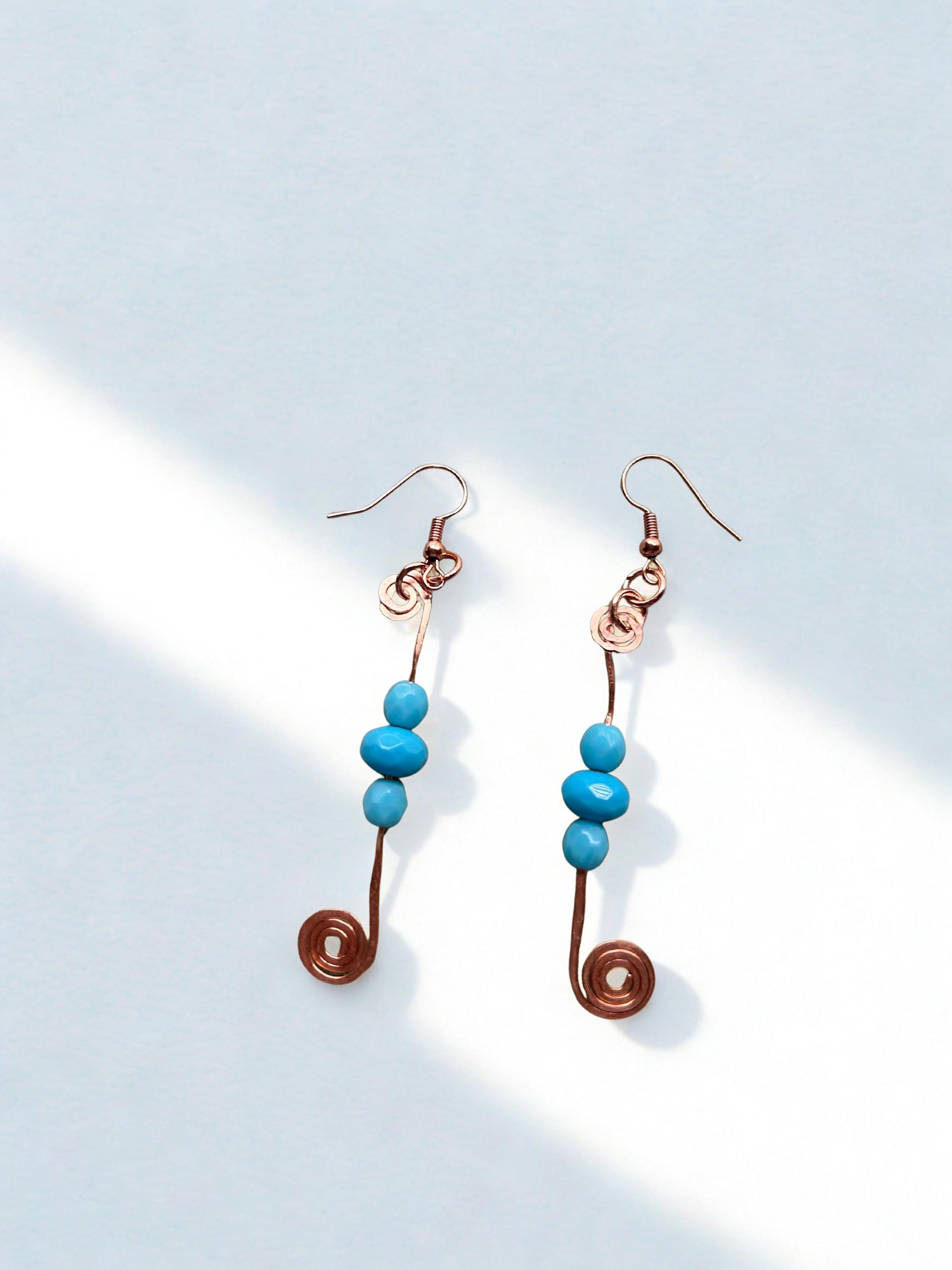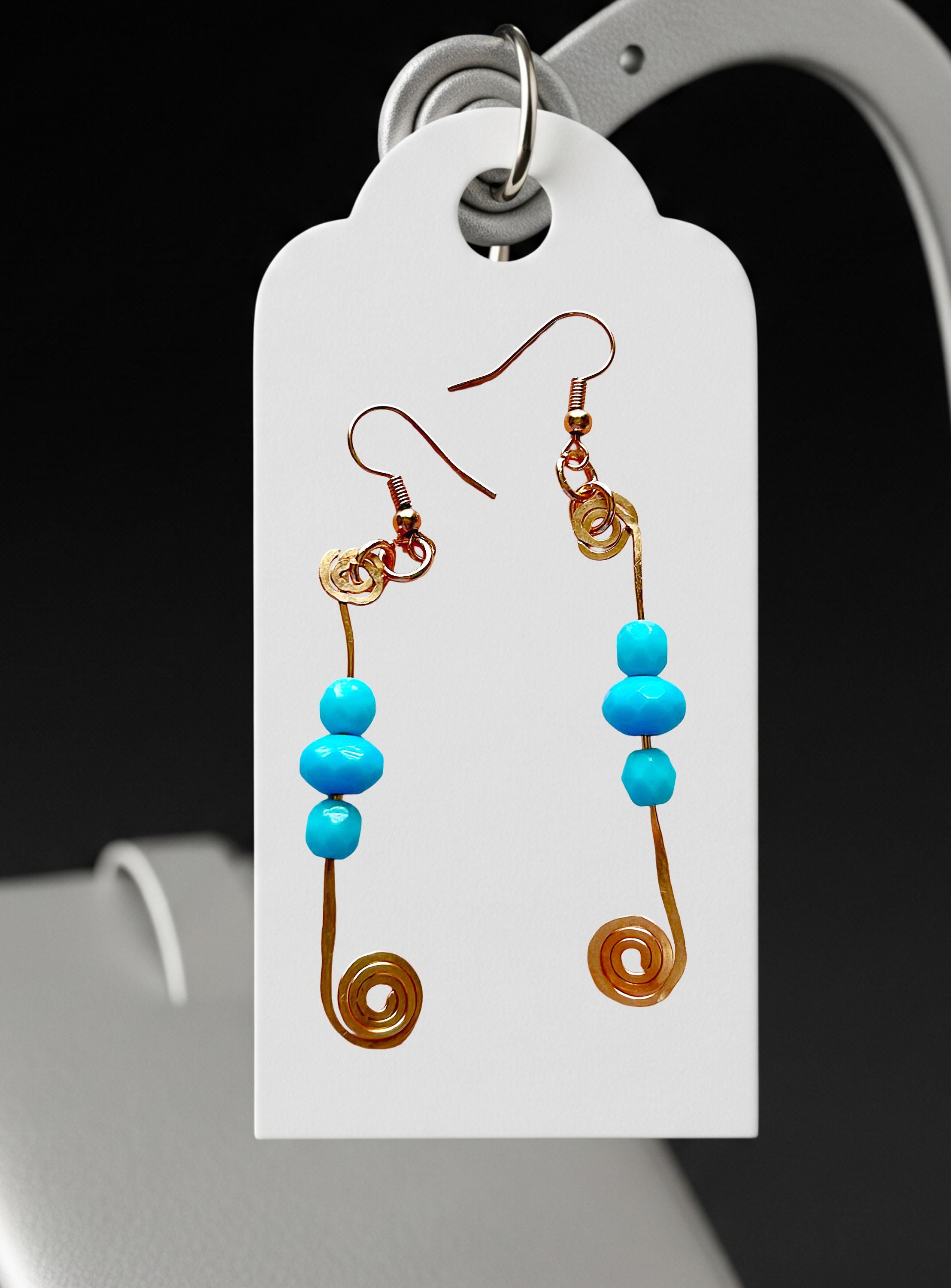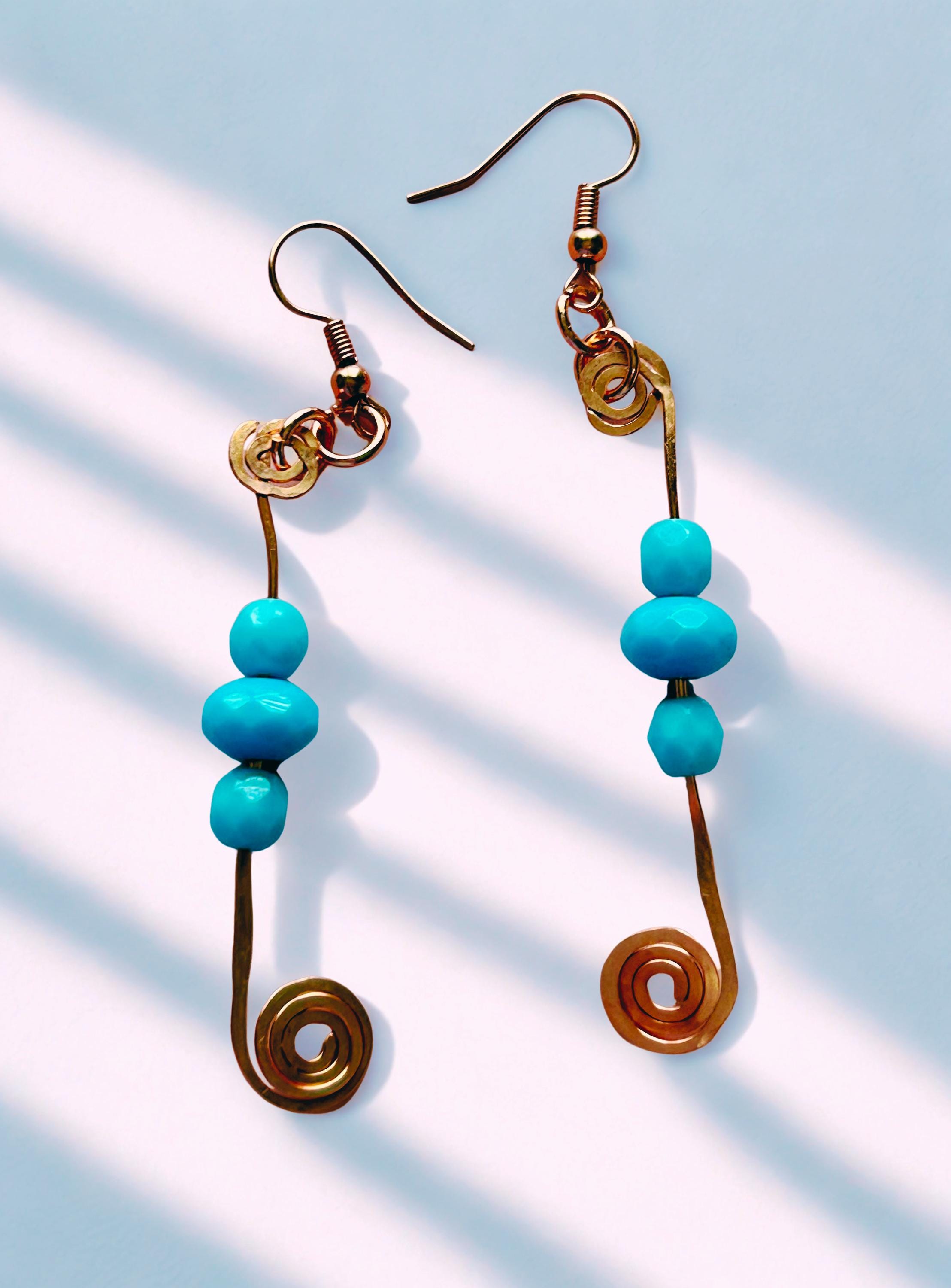 These wire wrapped hammered copper spiral earrings with turquoise glass beads showcase a rondelle shape and a hook closure. The earrings feature turquoise glass beads as the main stone, Made of copper wire with a nickel-free feature, these earrings are 3 inches in length and about a 1/2 inch wide. The bohemian style makes these earrings a unique and beautiful accessory for women looking to add a touch of nature to their outfit. These earrings are proudly handmade.