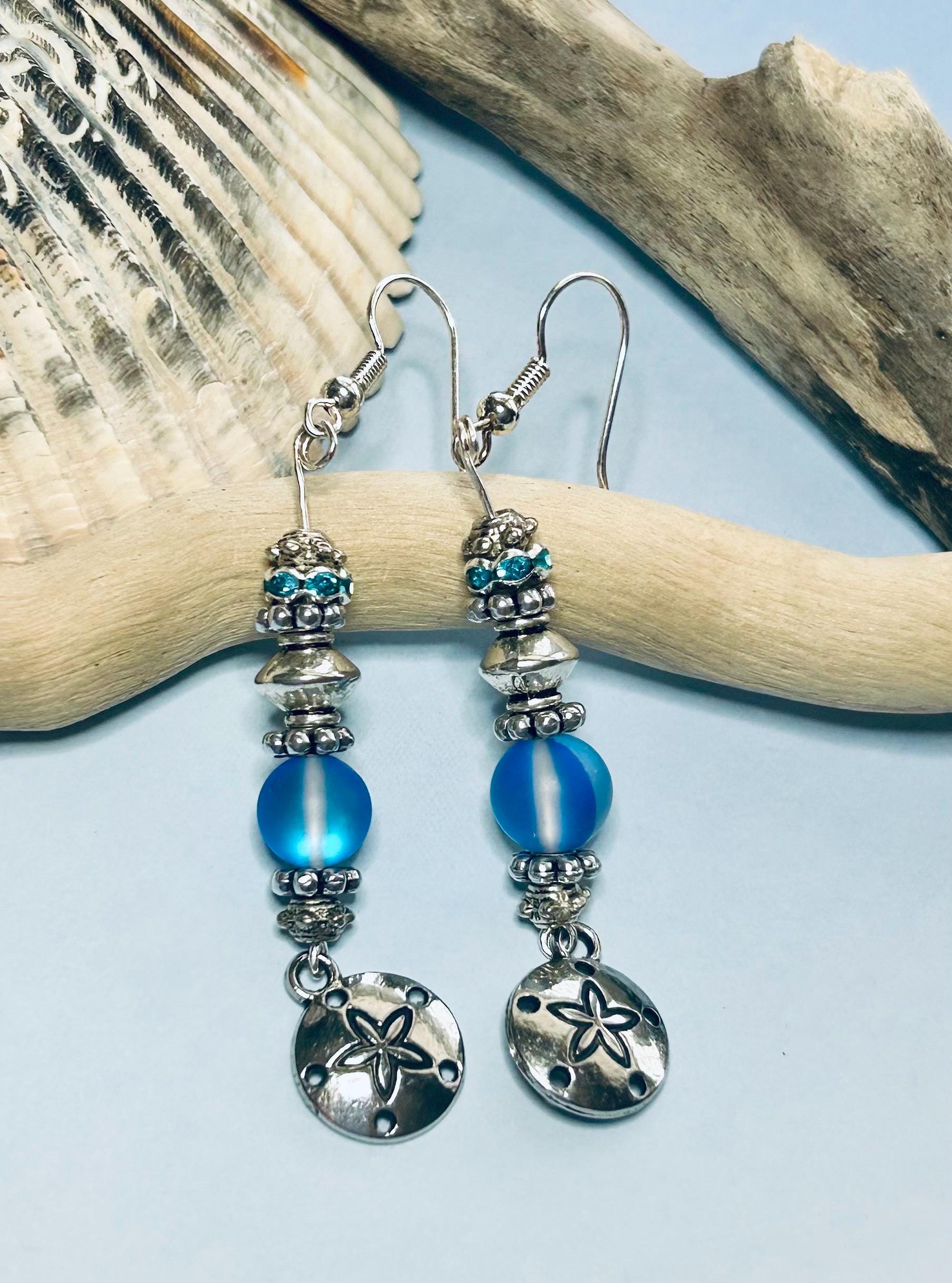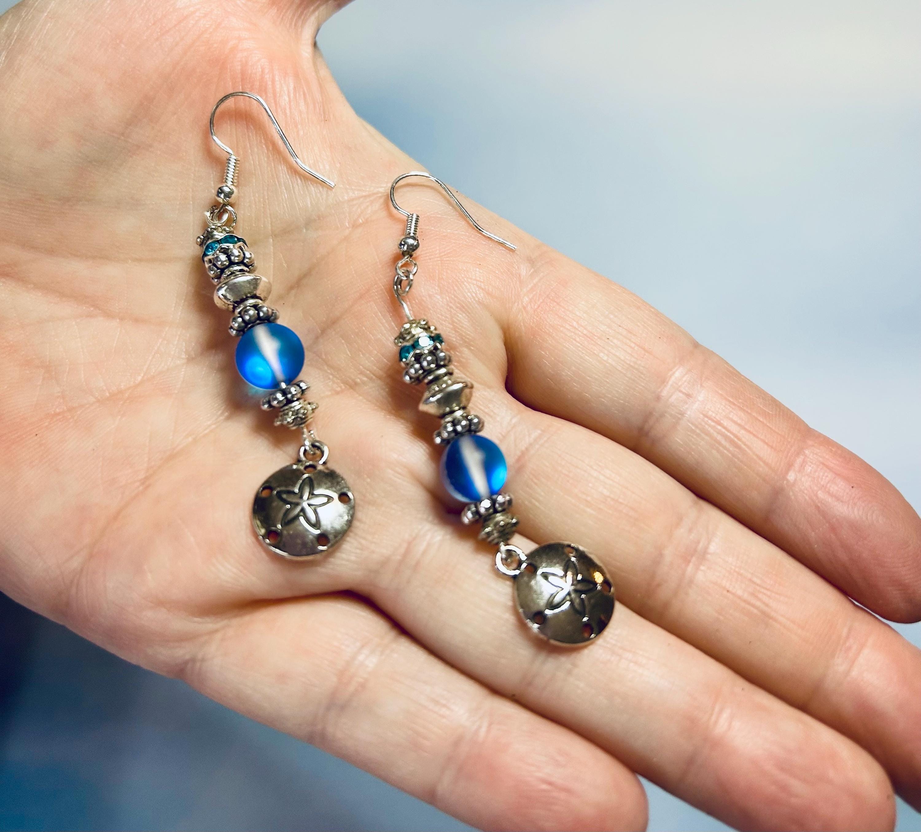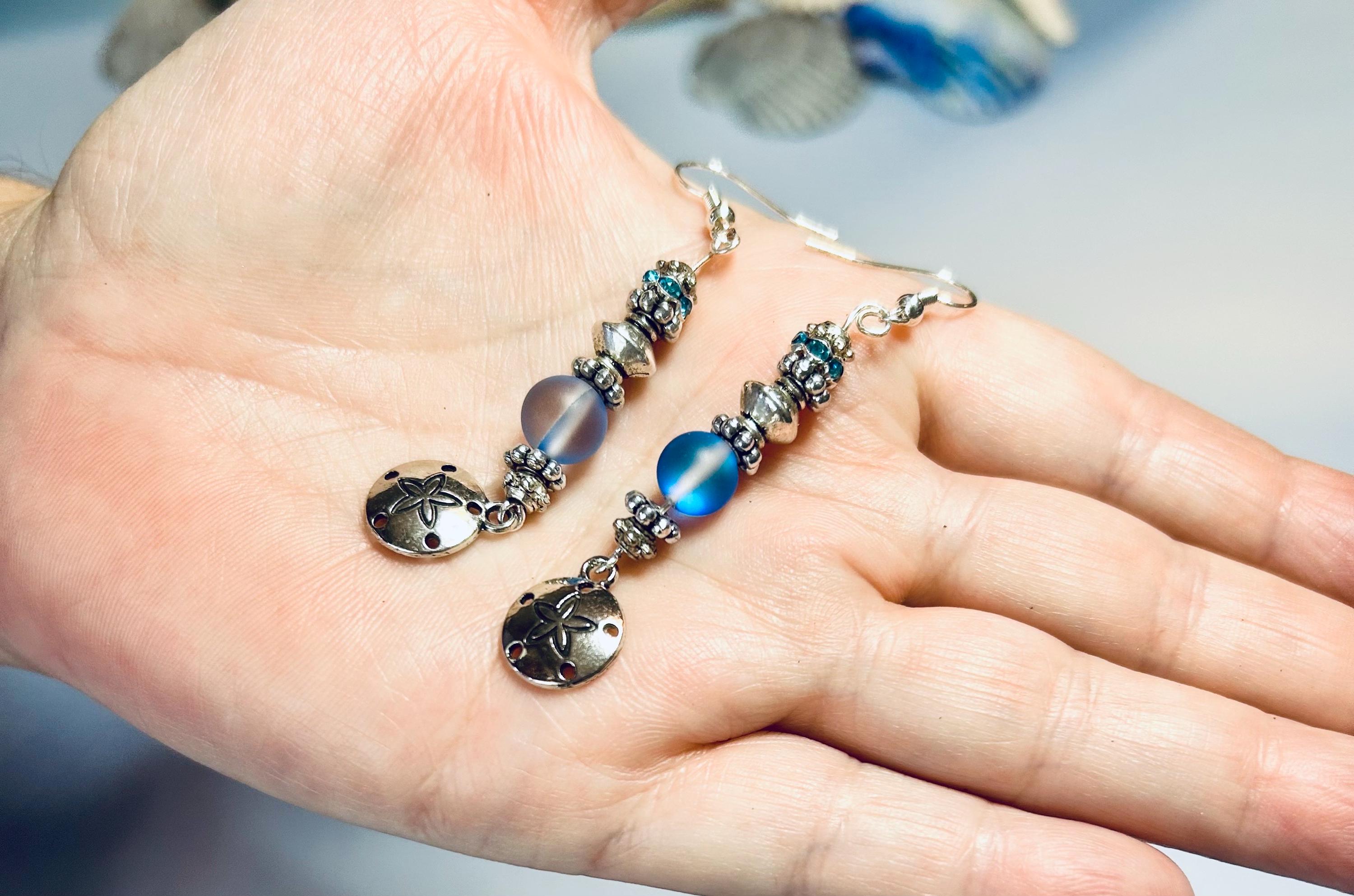 These Sand Dollar Blue Mermaid Bead Dangle Earrings are handmade in the United States and feature a unique design inspired by nature and sea life. The earrings are silver plated and nickel-free, making them safe for sensitive ears. The main stones are 8mm round blue glass beads, adding a pop of color to any outfit. With a length of 2.5 inches and a width of 8mm, these earrings are perfect for a variety of occasions such as Mother's Day, Christmas, birthdays, and anniversaries.