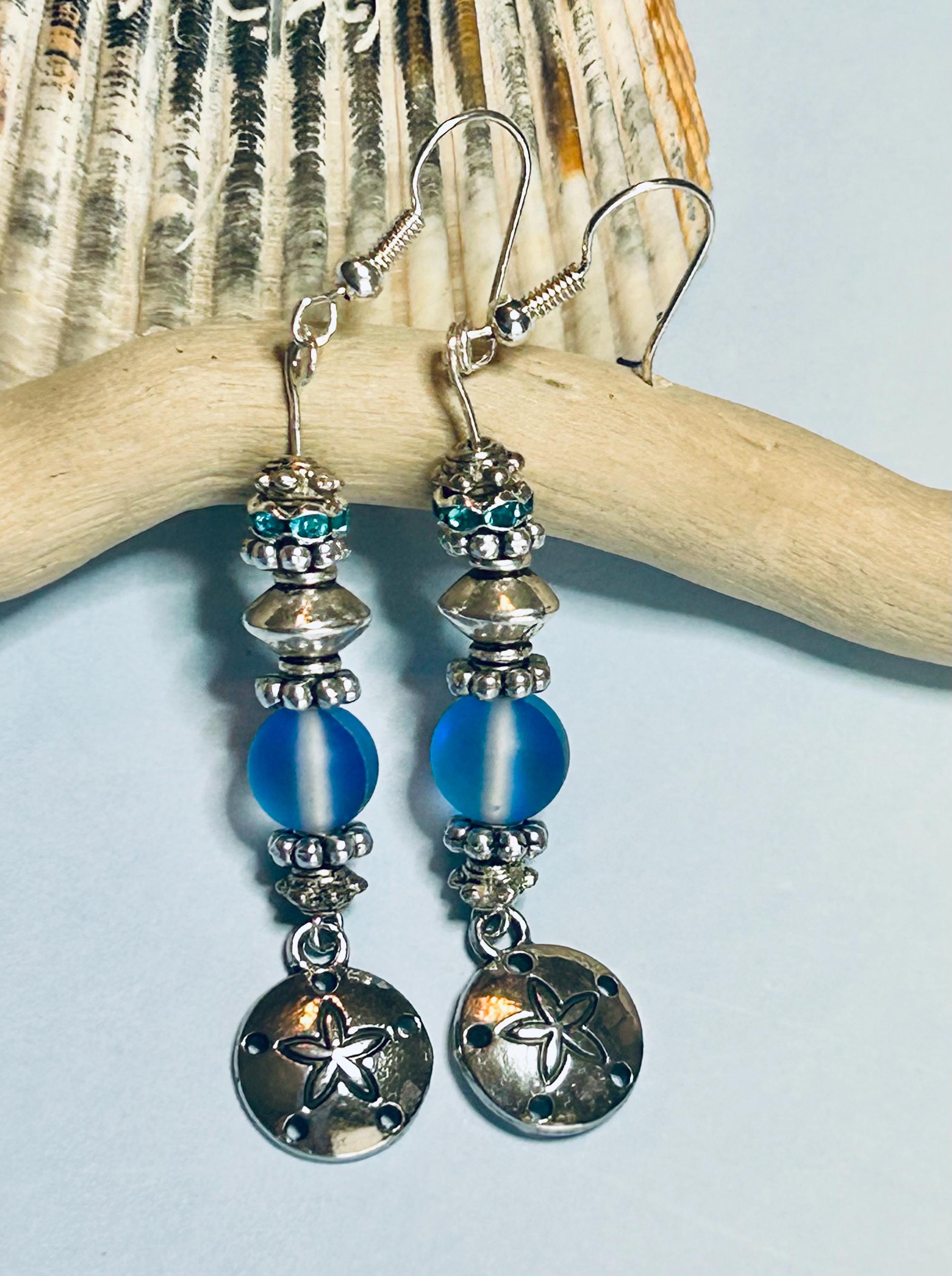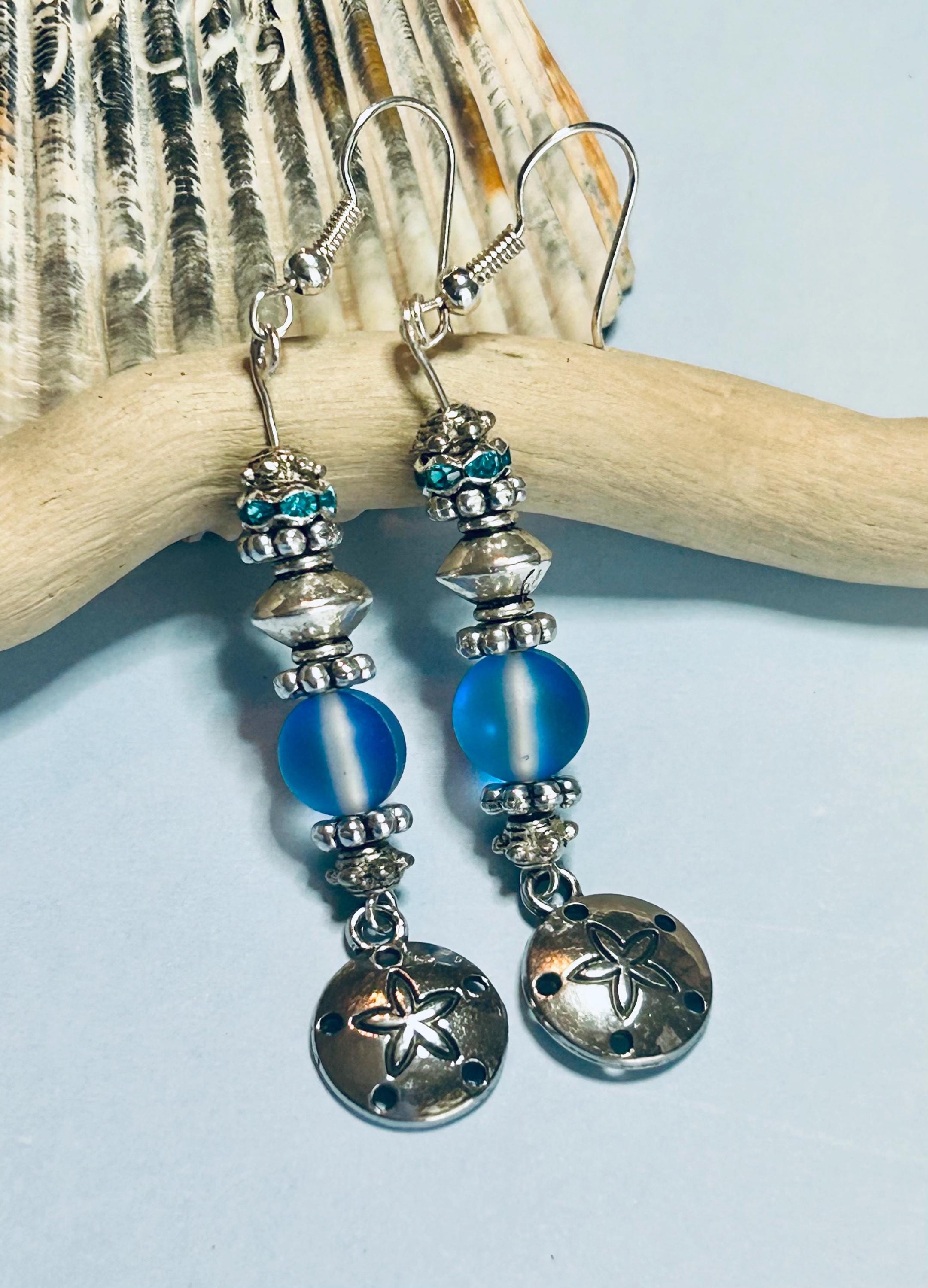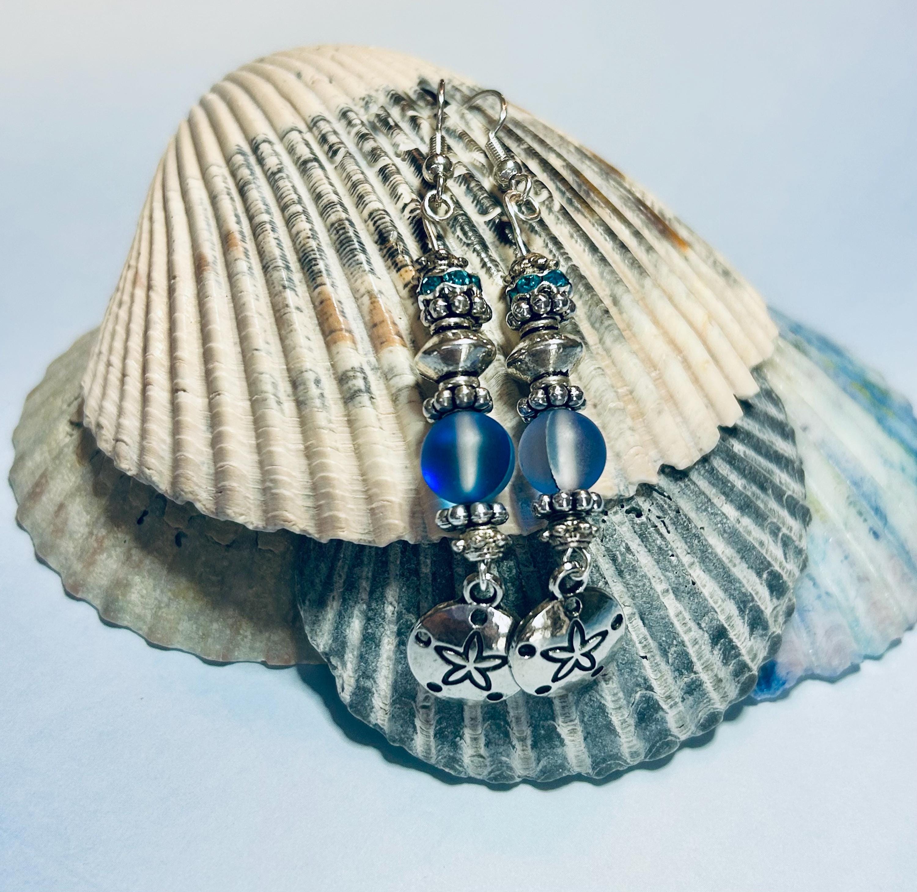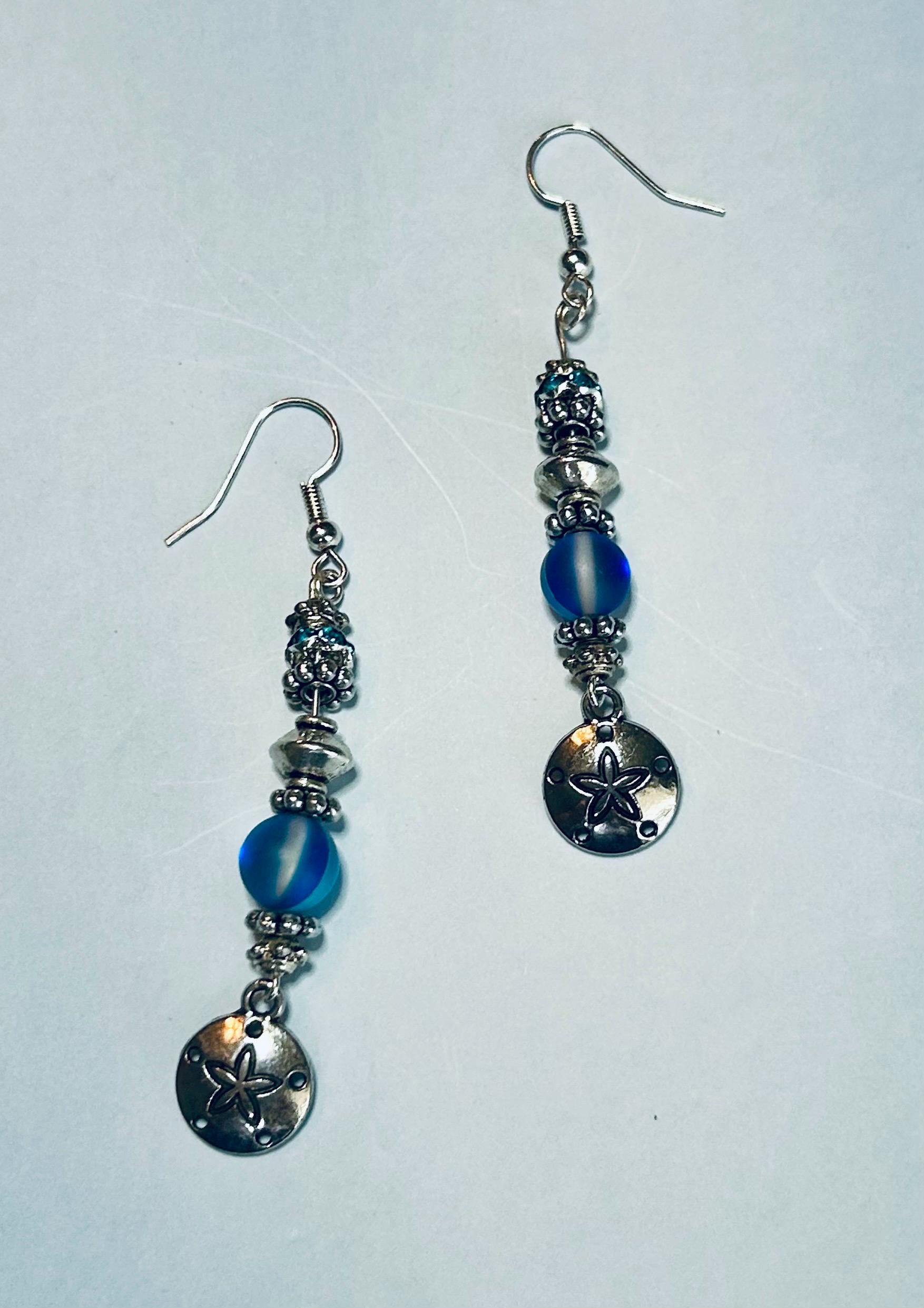 These Sand Dollar Blue Mermaid Bead Dangle Earrings are handmade in the United States and feature a unique design inspired by nature and sea life. The earrings are silver plated and nickel-free, making them safe for sensitive ears. The main stones are 8mm round blue glass beads, adding a pop of color to any outfit. With a length of 2.5 inches and a width of 8mm, these earrings are perfect for a variety of occasions such as Mother's Day, Christmas, birthdays, and anniversaries.