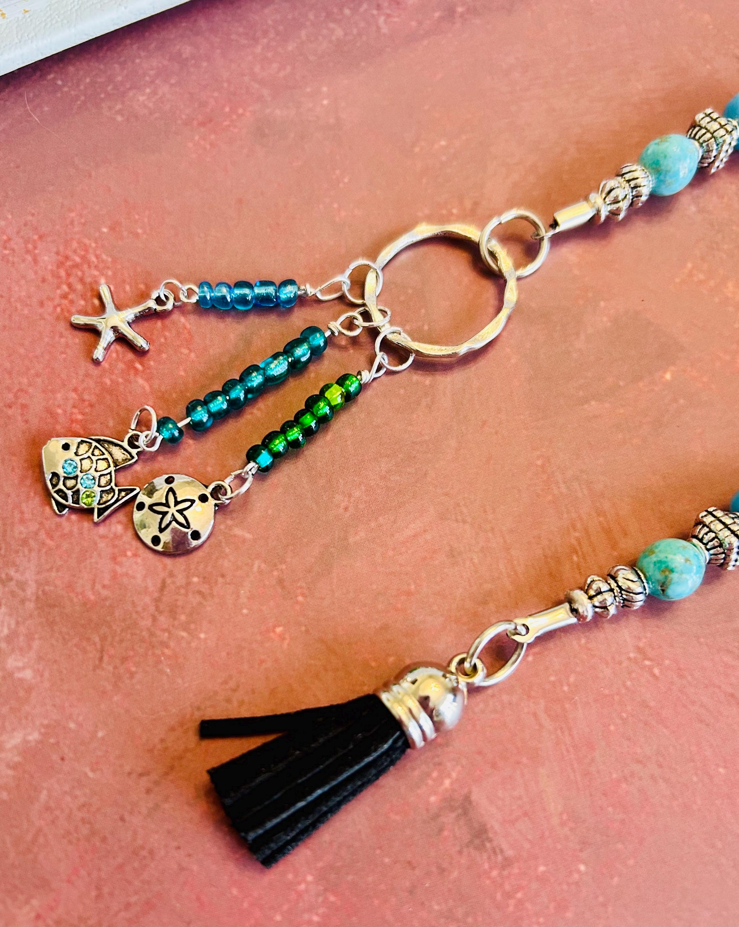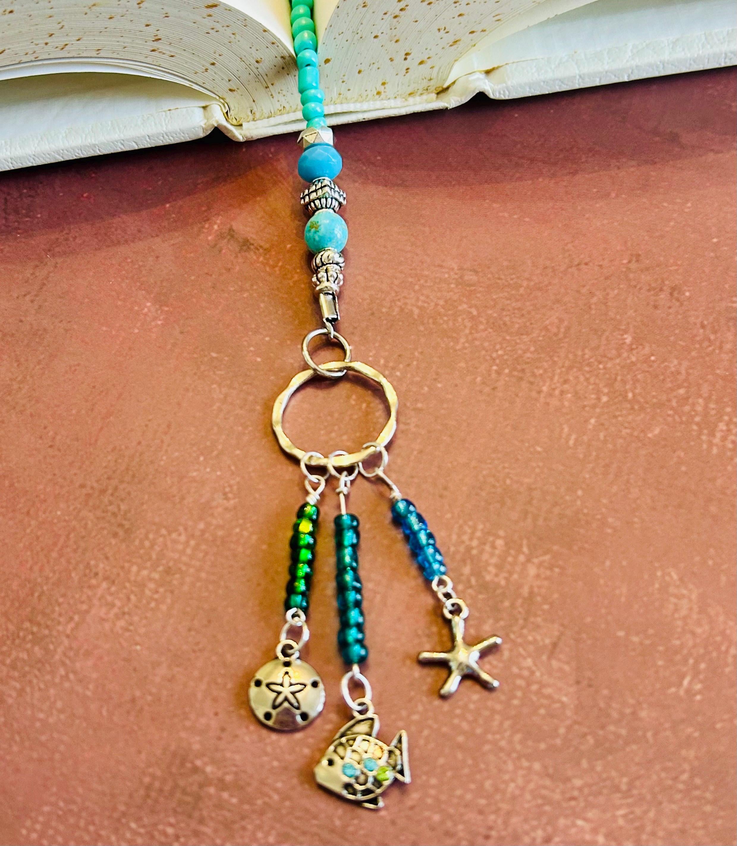 On one end of the bookmark I have added a textured metal ring with three dangles of glass seed beads attached in greens and blues along with stainless steel charms; a sand dollar, a star fish and a fish with green and blue glass beads. On the other end is a tassel in black suede with a silver metal cap. They are all strung together with a polyester beading cord.