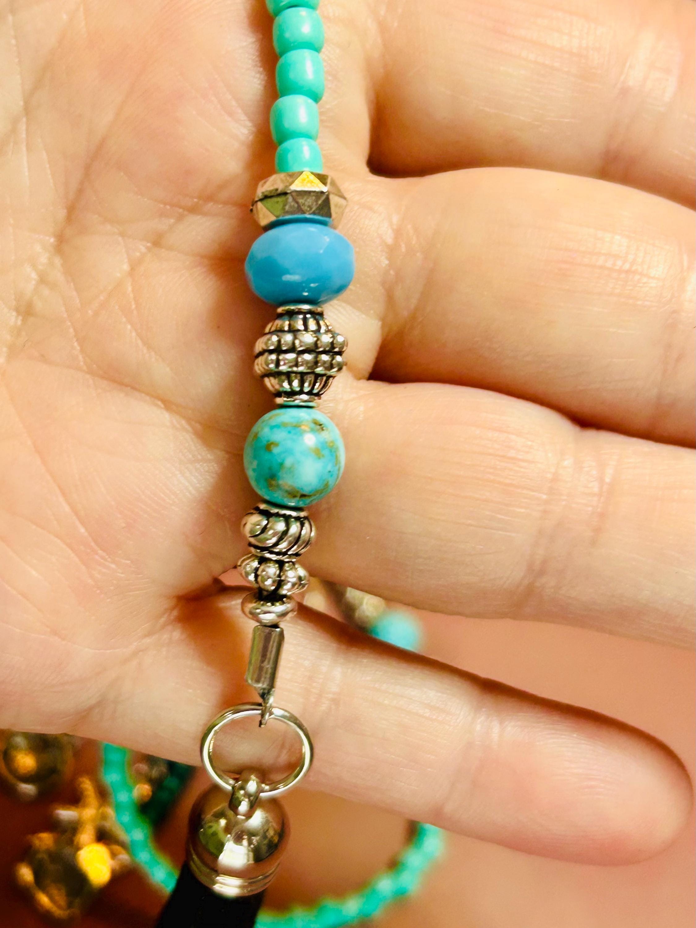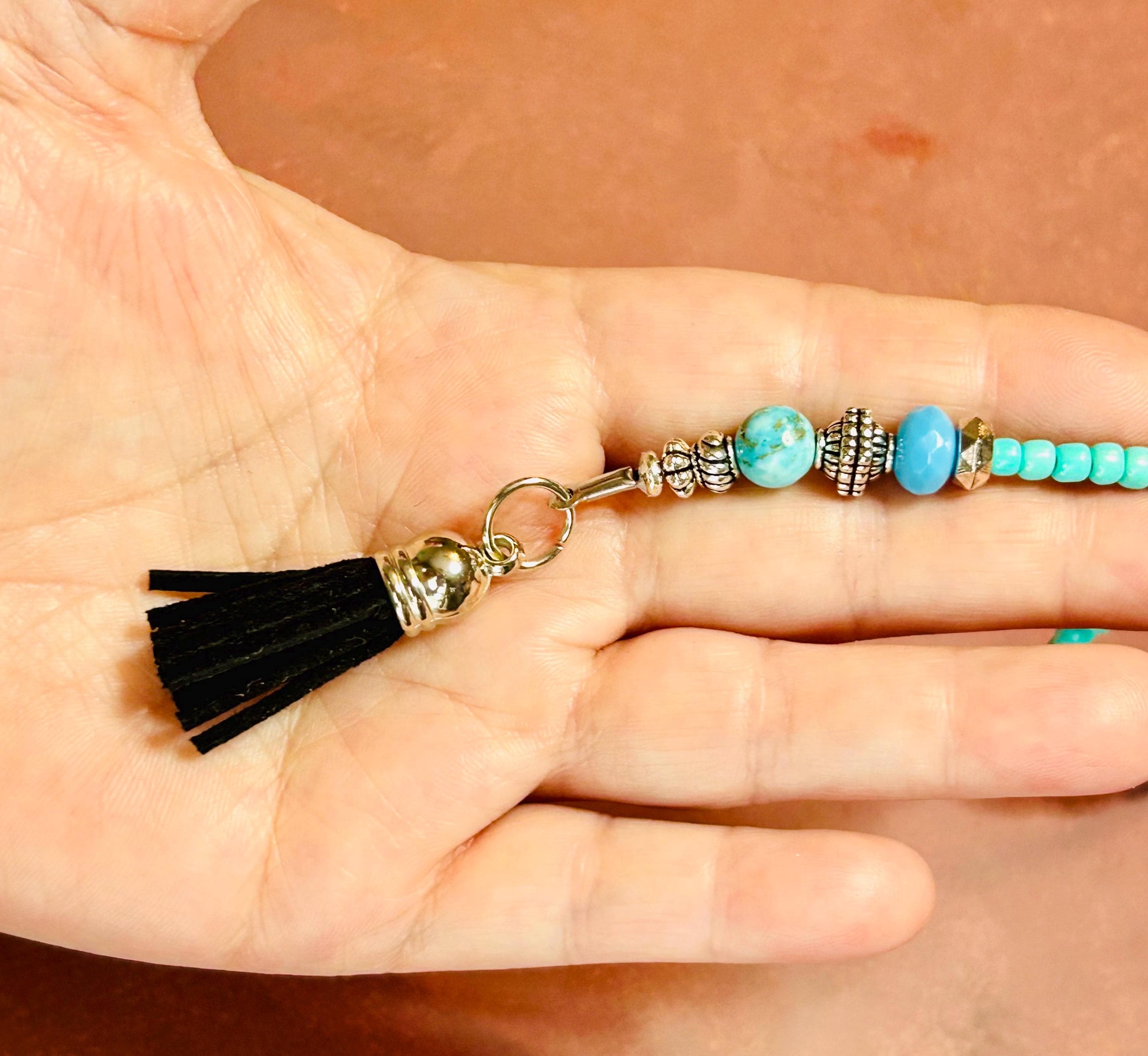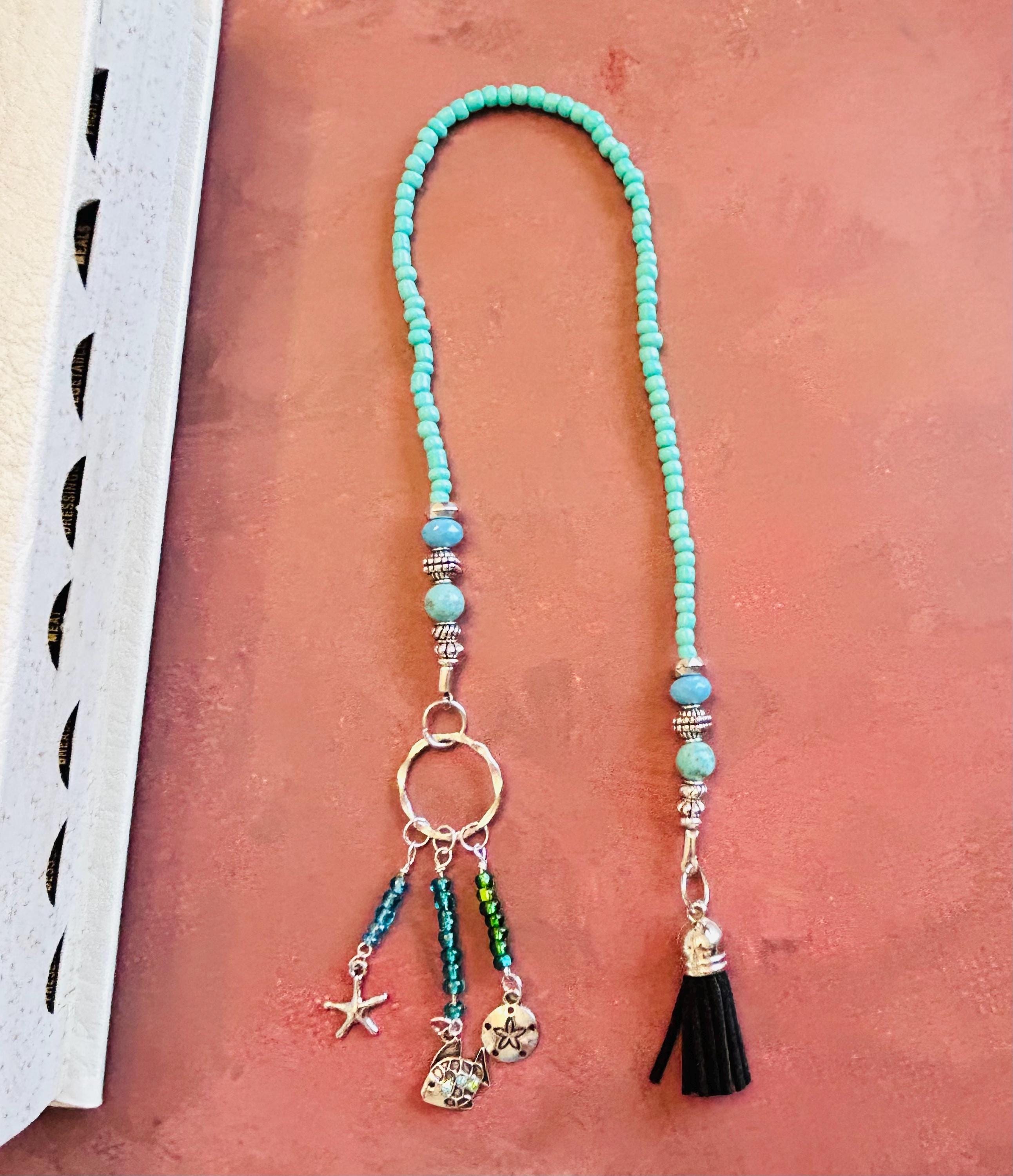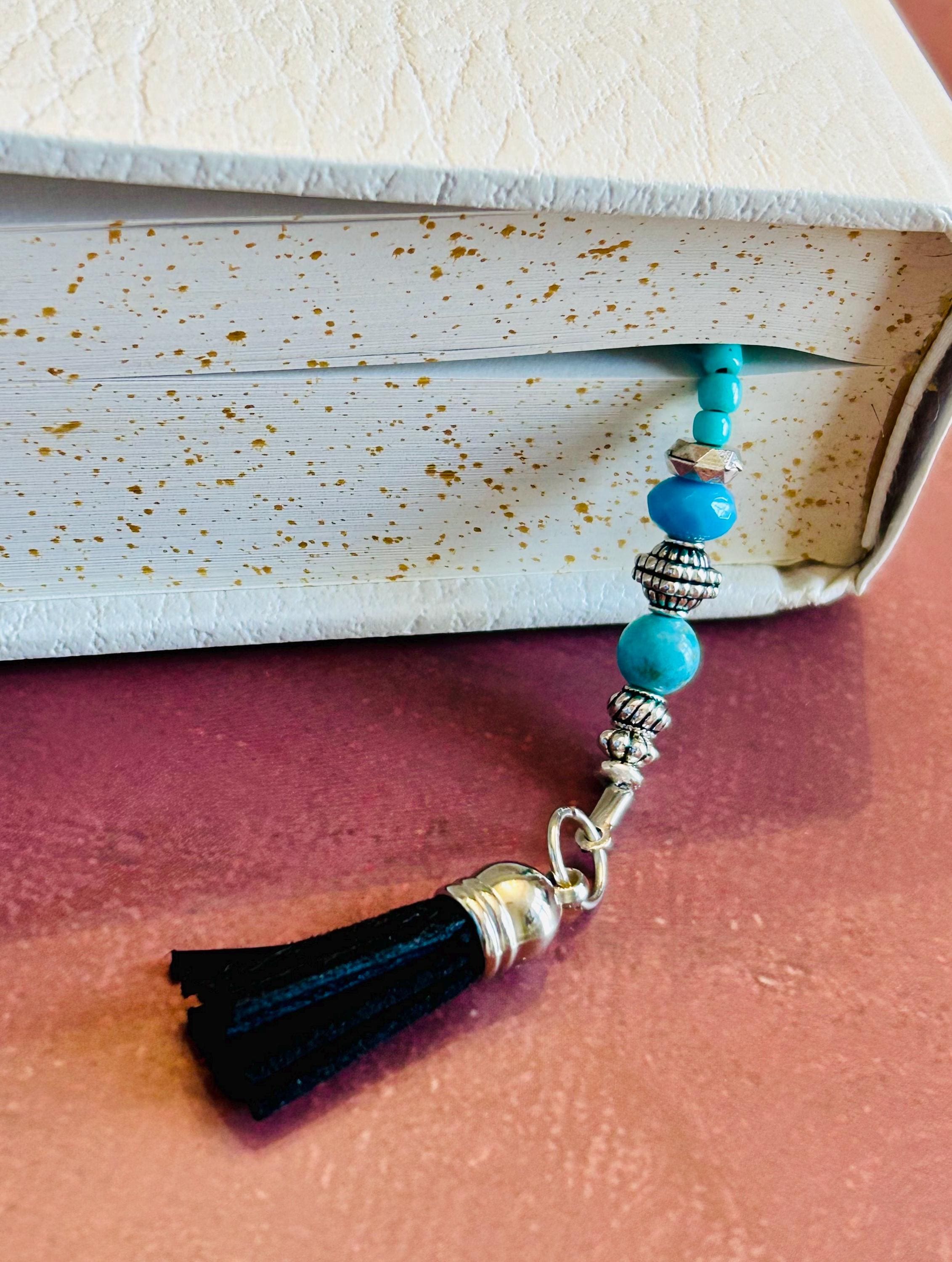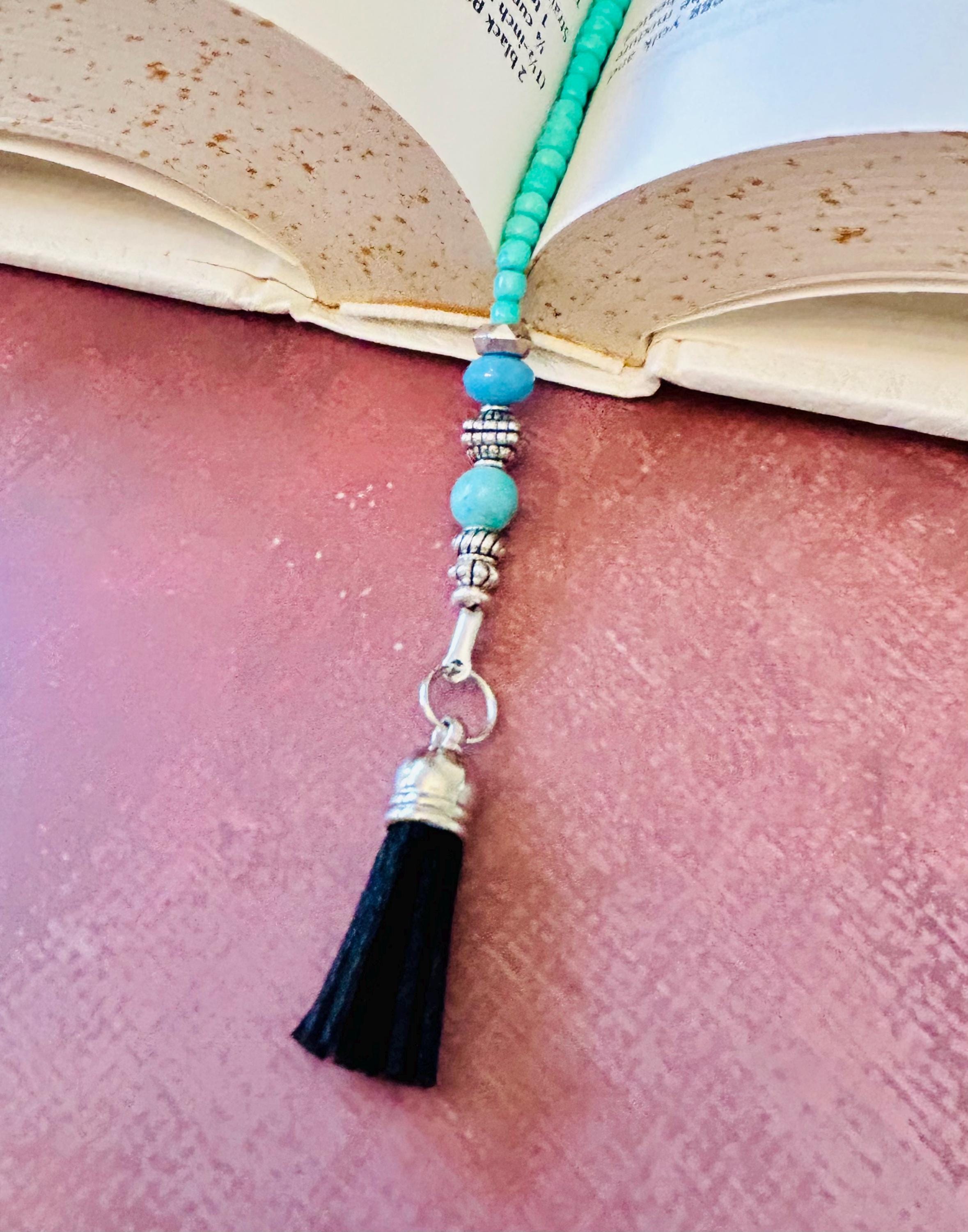 Handmade beaded bookmark made with turquoise Howlite beads, blue faceted rondelle glass beads and a variety of stainless steel spacer beads. The tiny, glass seed beads are turquoise in color and fit within the book while the jeweled ends dangle outside the book so you can easily find your place and to add a bit of sparkle to your reading.