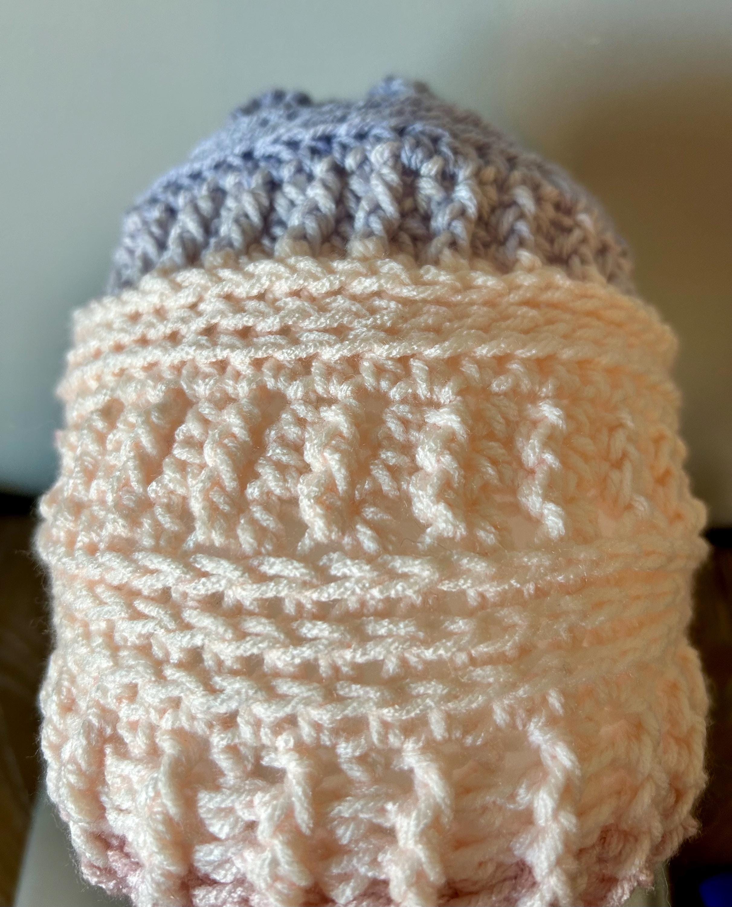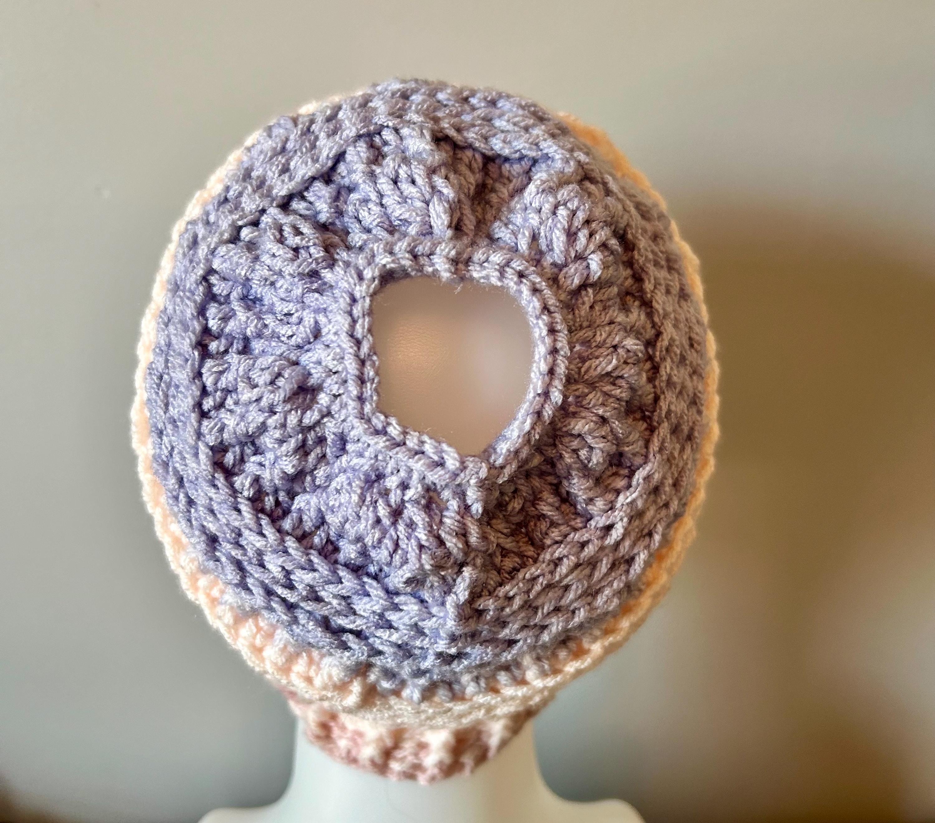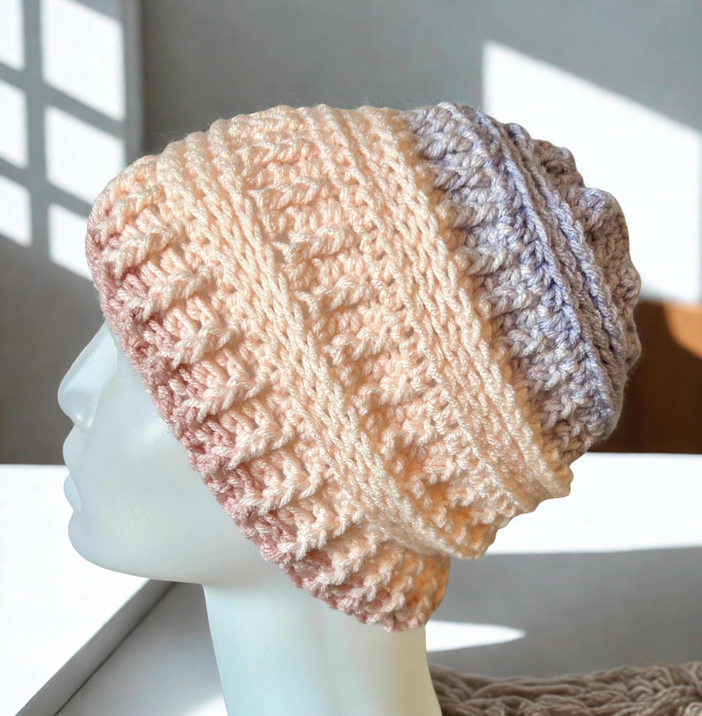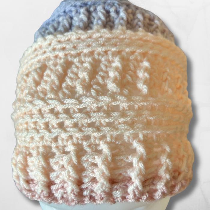 The Crochet Messy Bun Hat in Light Pink/Purple is a handmade beanie perfect for travel, activewear, and casual occasions. Made of acrylic material with an elastic crocheted into the top opening to hold your messy bun or ponytail securely. This hat features a solid color blocking design in shades of light pink to purple. It has a stretchy construction, making it packable and breathable for outdoor wear in the winter and fall seasons. With a modern and colorful theme, this hat adds a touch of hipster and festival flair to any outfit, making it a stylish and versatile accessory for women looking to add a pop of pink to their wardrobe.