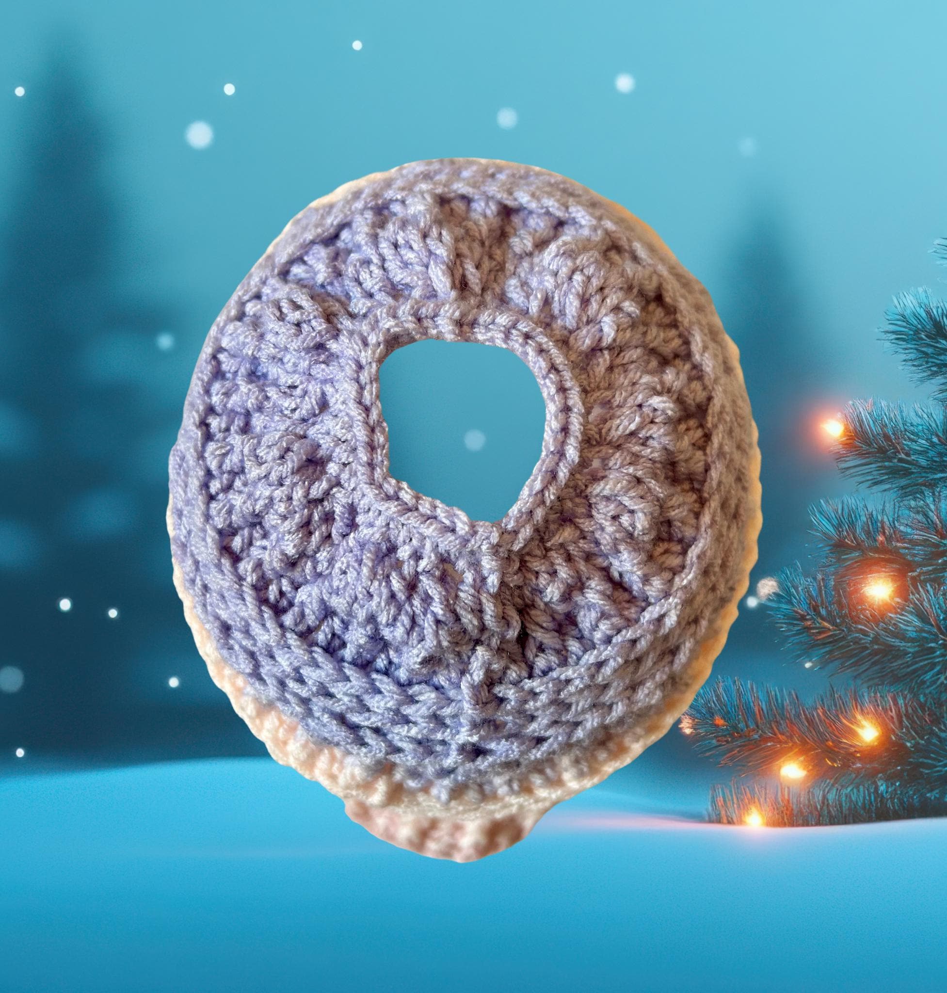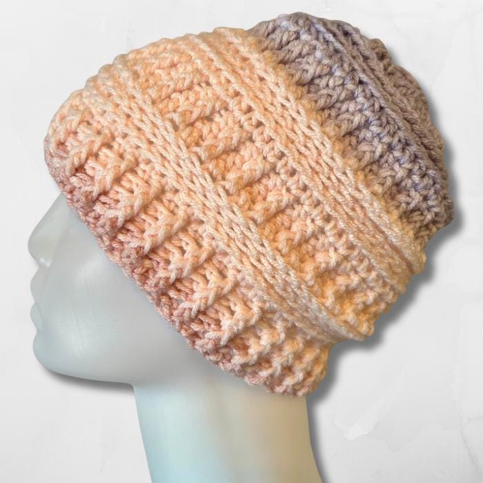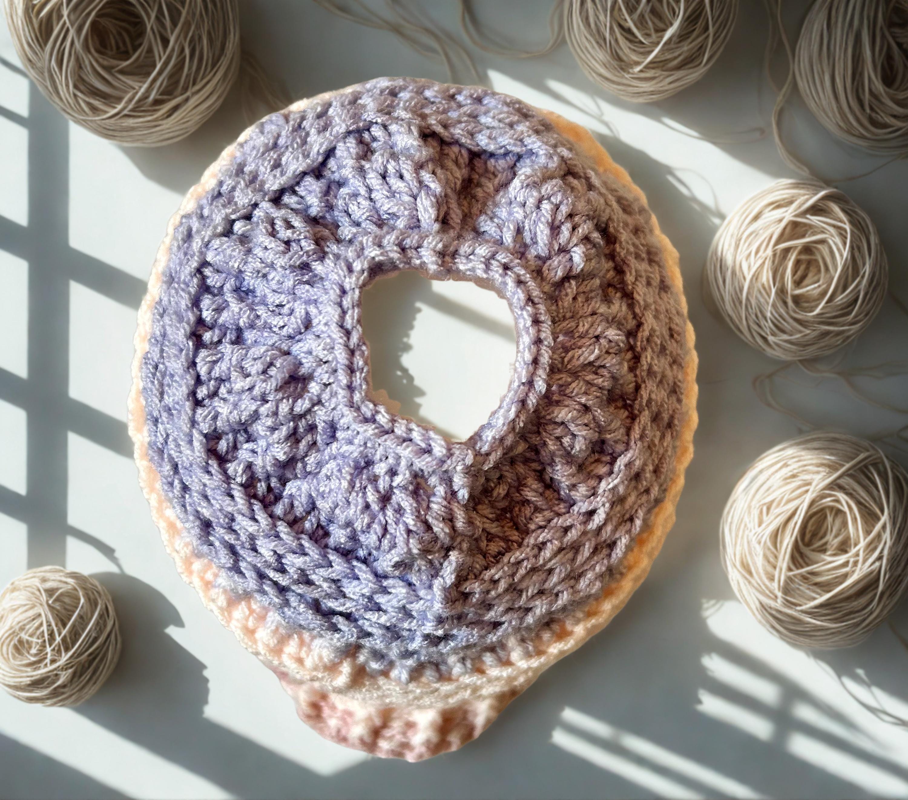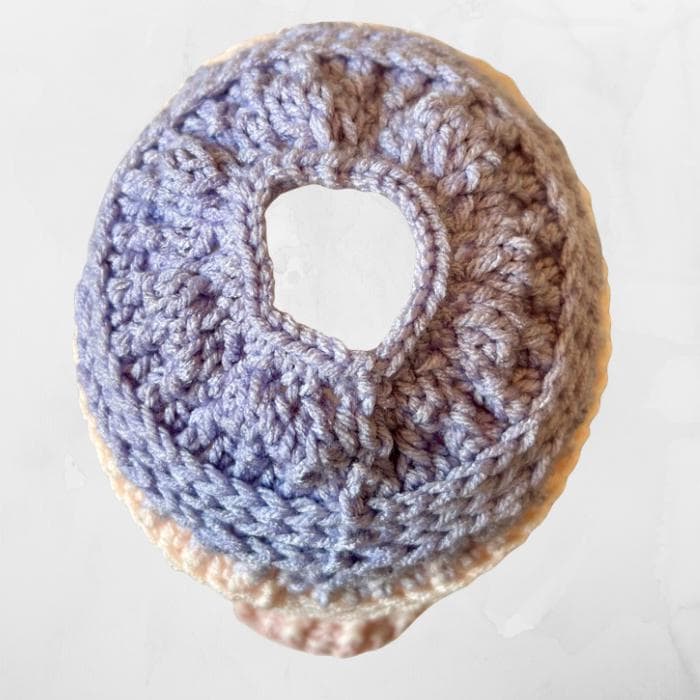 Made with Hobby Lobby’s Yarn Bee Sugarwheel in the colorway Gimme Cobbler this yarn features a gorgeous variegated color and an amazingly soft construction. It is 100% acrylic and easy to take care of. I do recommend due to the handmade structure to wash in delicate, dry on low or flat.